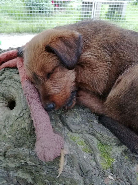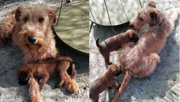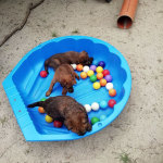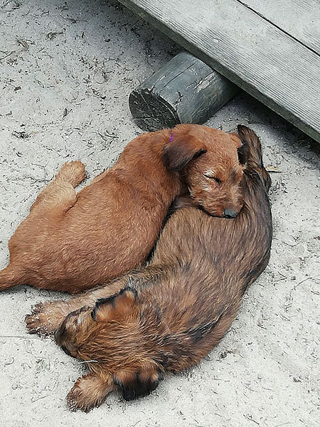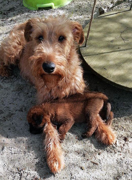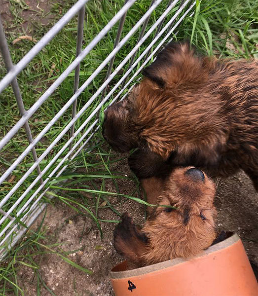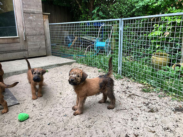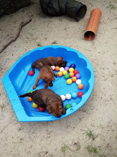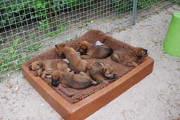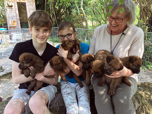 Mutti Louise ist natürlich die Beste und versteht es aufzupassen. Die Welpen haben im Außenbereich jede Menge Abwechslung und weil sie total neugierig sind, auch viele Gelegenheiten allerlei