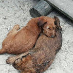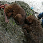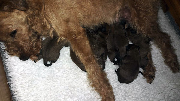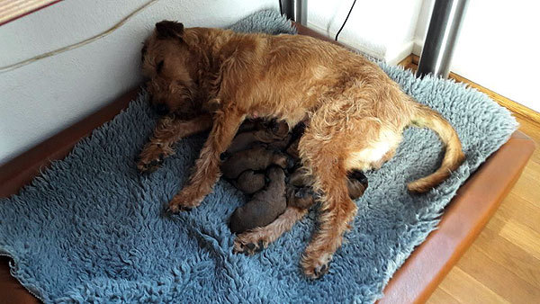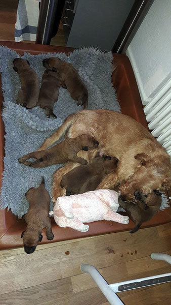 Louise ist eine instinksichere Hundemutter. Die Welpen laben sich an der Milchbar.